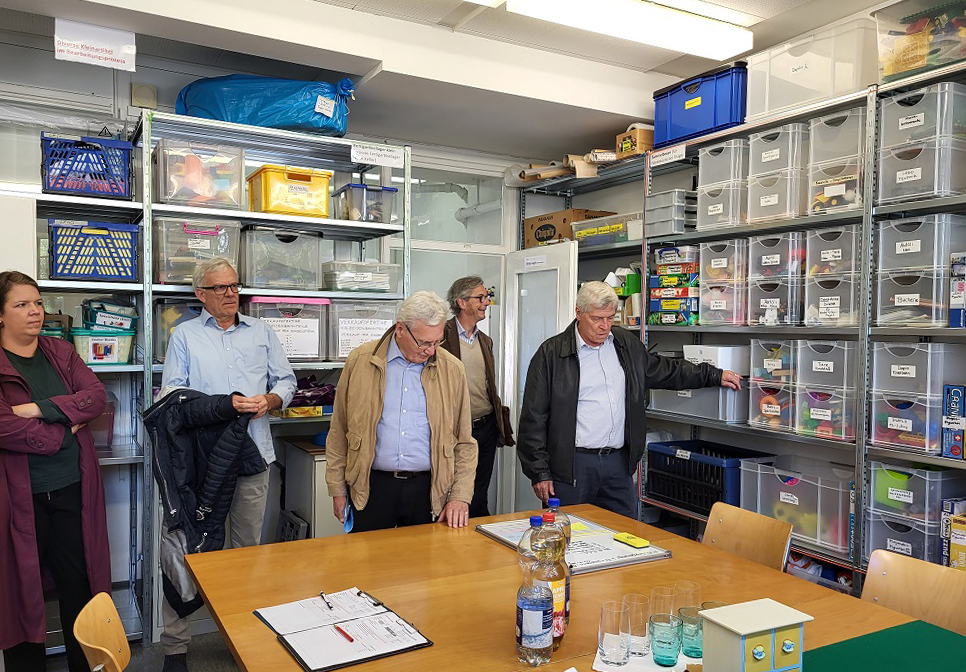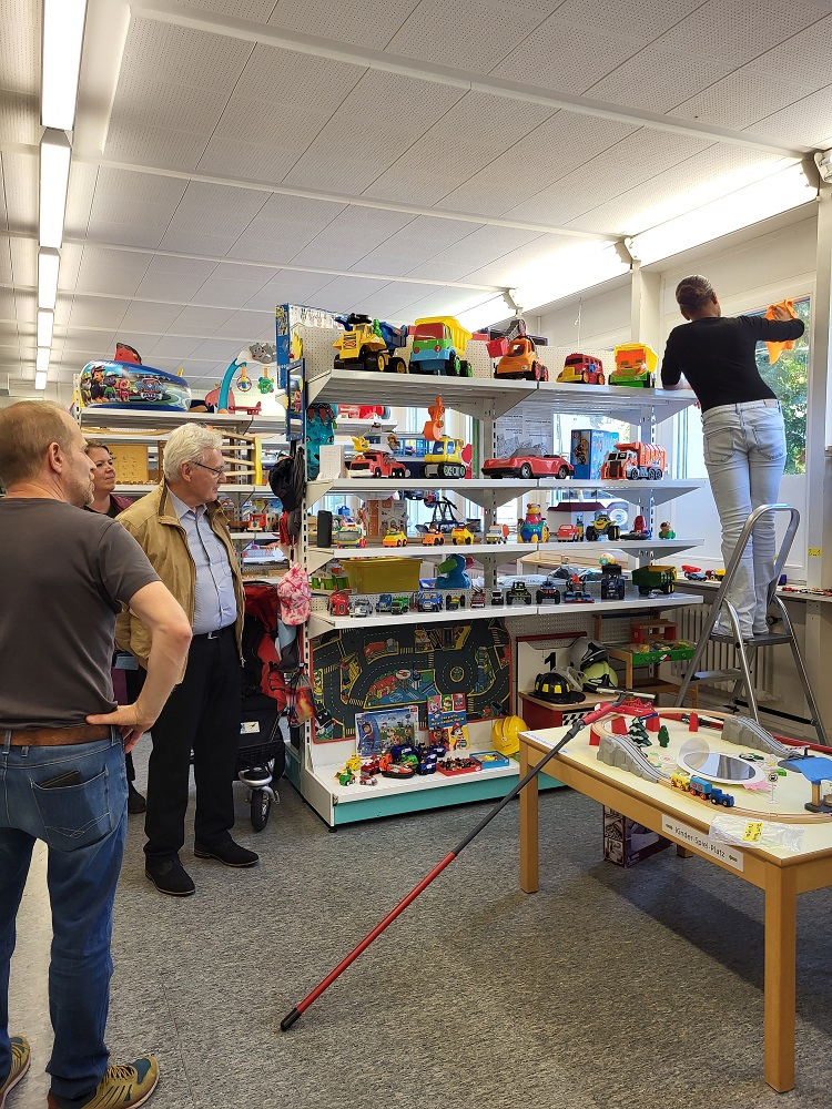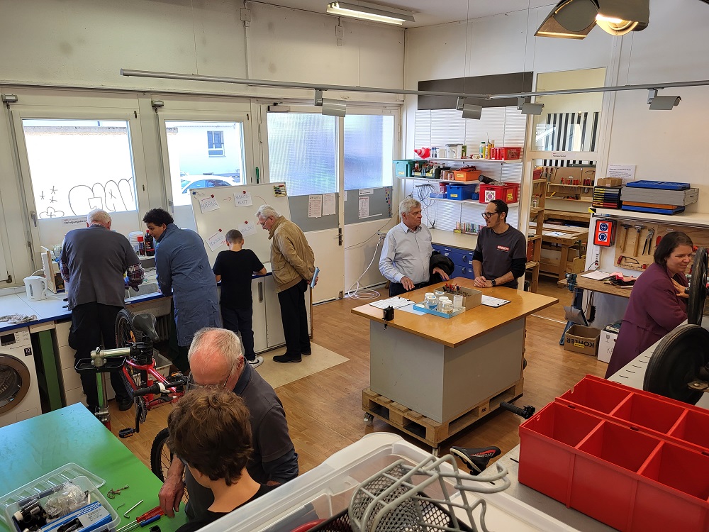 Der Rundgang durch die Räume beginnt im «Untergrund», dem Lagerraum, in dem die noch zu erneuernden Spielwaren, Fahrräder, Kinderfahrzeuge, Kindermöbel usw. auf ihre Bearbeitung warten. Hier erkennen wir, dass es nebst der Jugendarbeit gleichzeitig um die wachsende «Kreislaufwirtschaft» geht. Die nächsten beiden Räume sind Werkstätten. Wir sind sehr positiv überrascht über deren Helligkeit, die freundliche Atmosphäre und insbesondere die fast klinische Sauberkeit und Ordnung. Jedes Werkzeug, jedes Ersatzteil hat seinen Platz, alles ist minutiös beschriftet. Die anwesenden Kinder und Jugendlichen arbeiten konzentriert unter der Anleitung von Werkstatt-TrainerInnen. Jeder Artikel wird auseinandergenommen, die Teile gereinigt, repariert und wieder zusammengesetzt. Einzelteile, die noch brauchbar sind werden als spätere Ersatzteile gelagert. Hier lernen die TeilnehmerInnen auch den richtigen Umgang mit verschiedensten Werkzeugen und Geräten wie Schraubenzieher, Feilen, Axt und Hammer, genauso wie Schraubzwingen oder Besen und Waschlappen. Zudem müssen alle am Ende des Tages einen Arbeitsrapport ausfüllen.