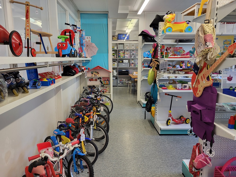 Die Vielfalt der «Produkte», bzw. der «verkäuflichen Artikel» im Verkaufsraum ist fast erschlagend. In allen Farben, Formen und Ausprägungen finden sich hier Spielzeuge, Bücher, Fahrräder, Trottinette und nicht selten Trouvaillen wie ein Gampiross (Schaukelpferd) oder eine Gitarre. Rund 15% des Gesamtumsatzes werden durch den Verkauf all dieser Gegenstände teils im Shop und teils auf Online-Plattformen erzielt. Etwa 85% wird durch Förderstiftungen, Firmen, Kirchen, Privatpersonen und der Stadt Zürich erbracht.
