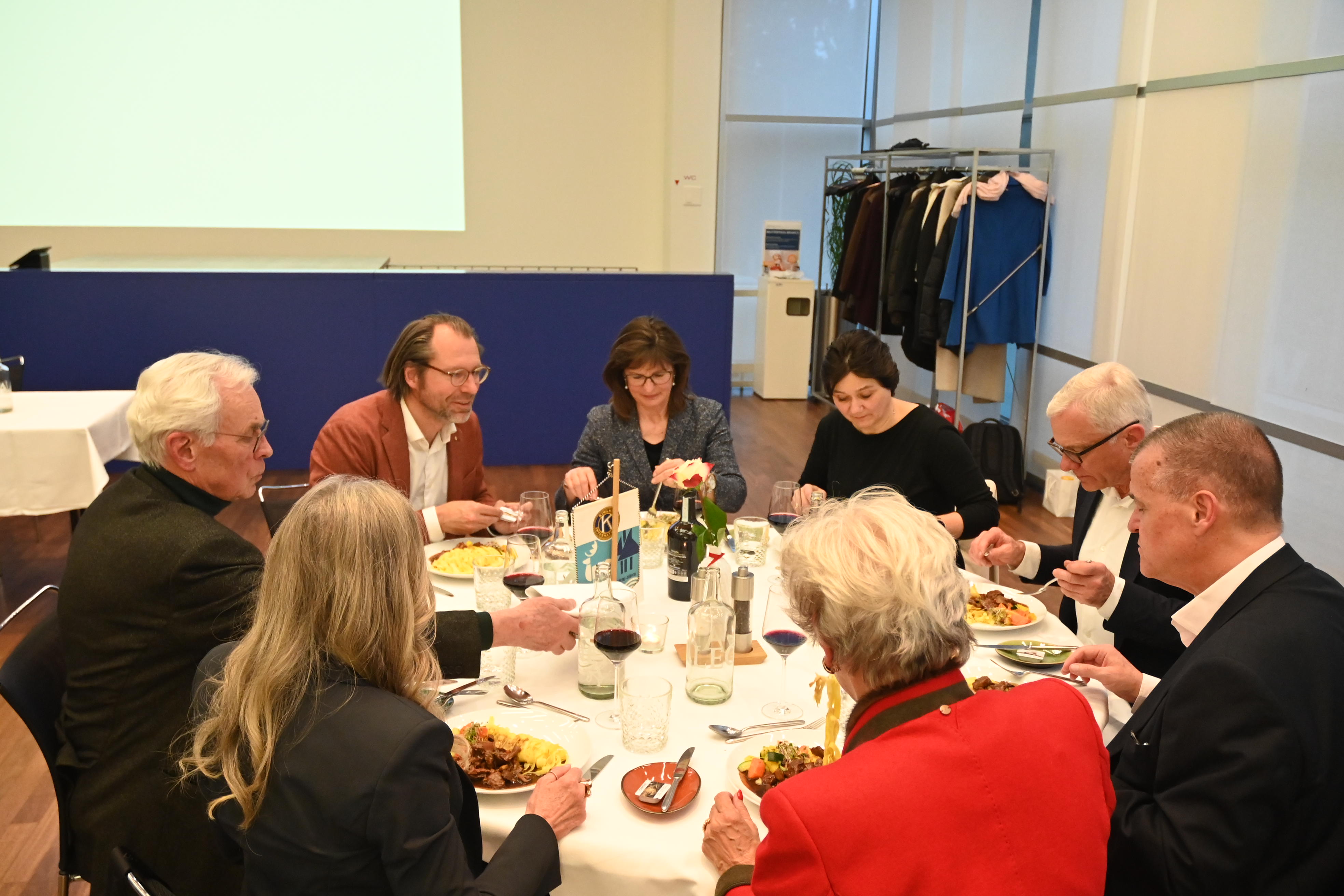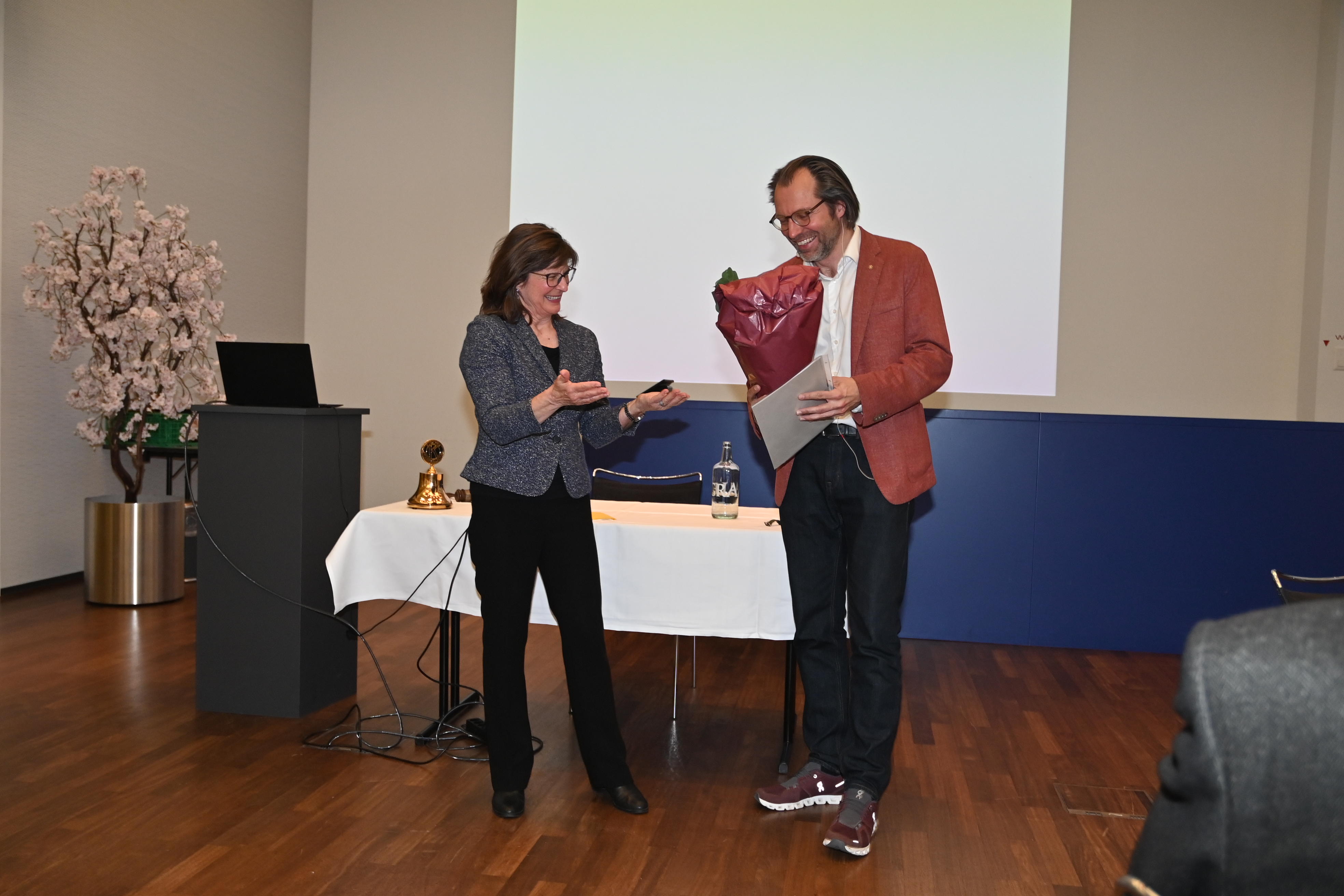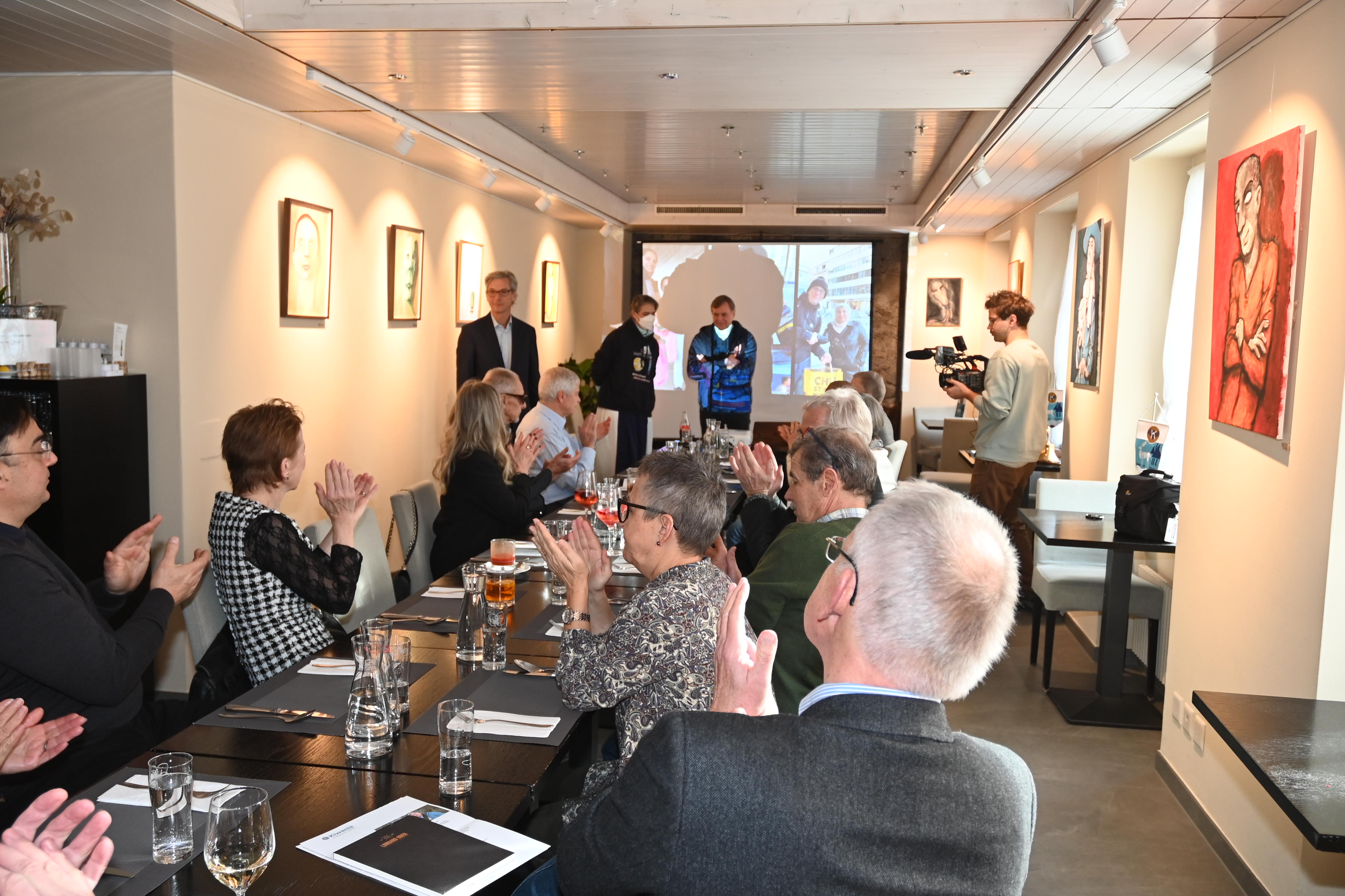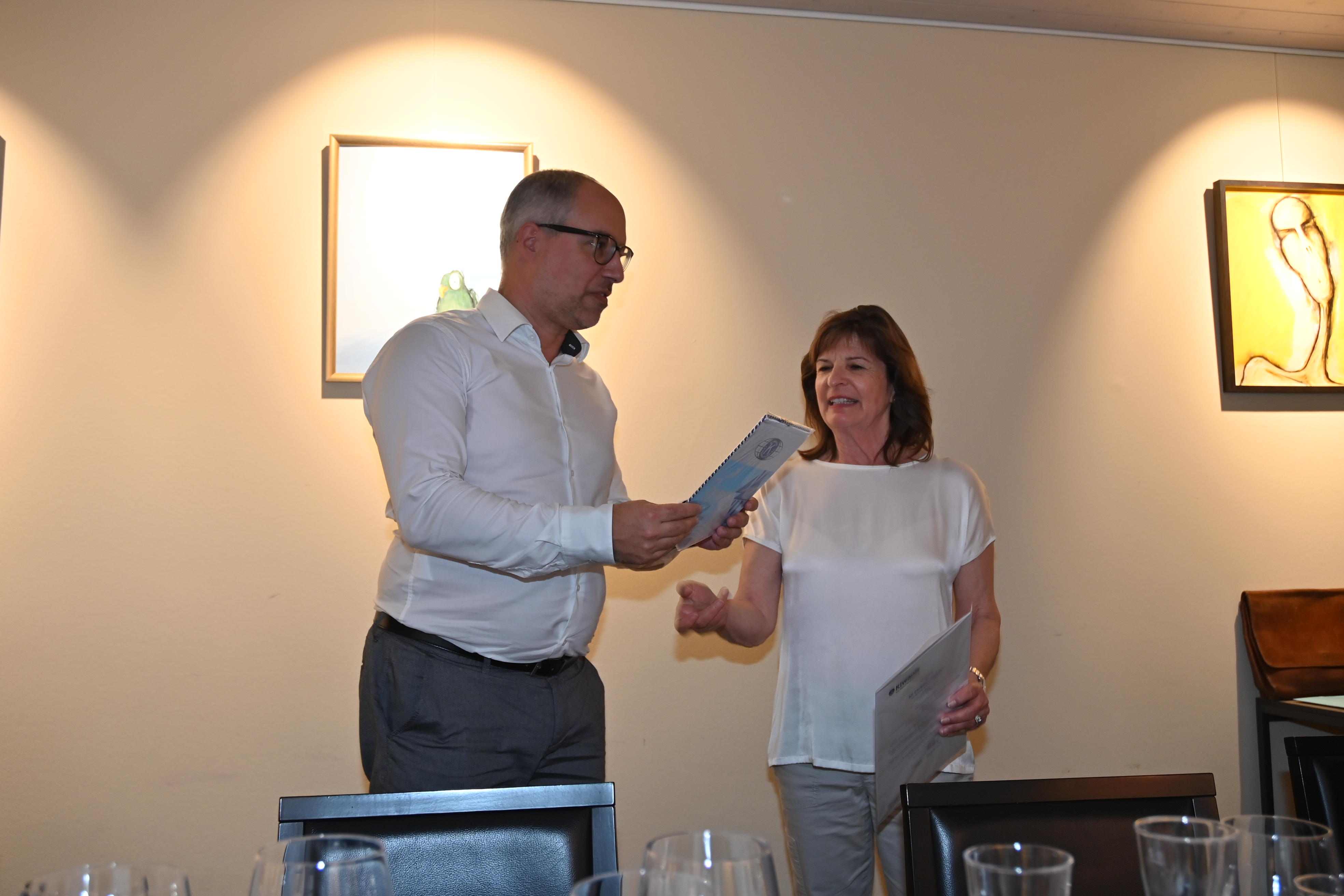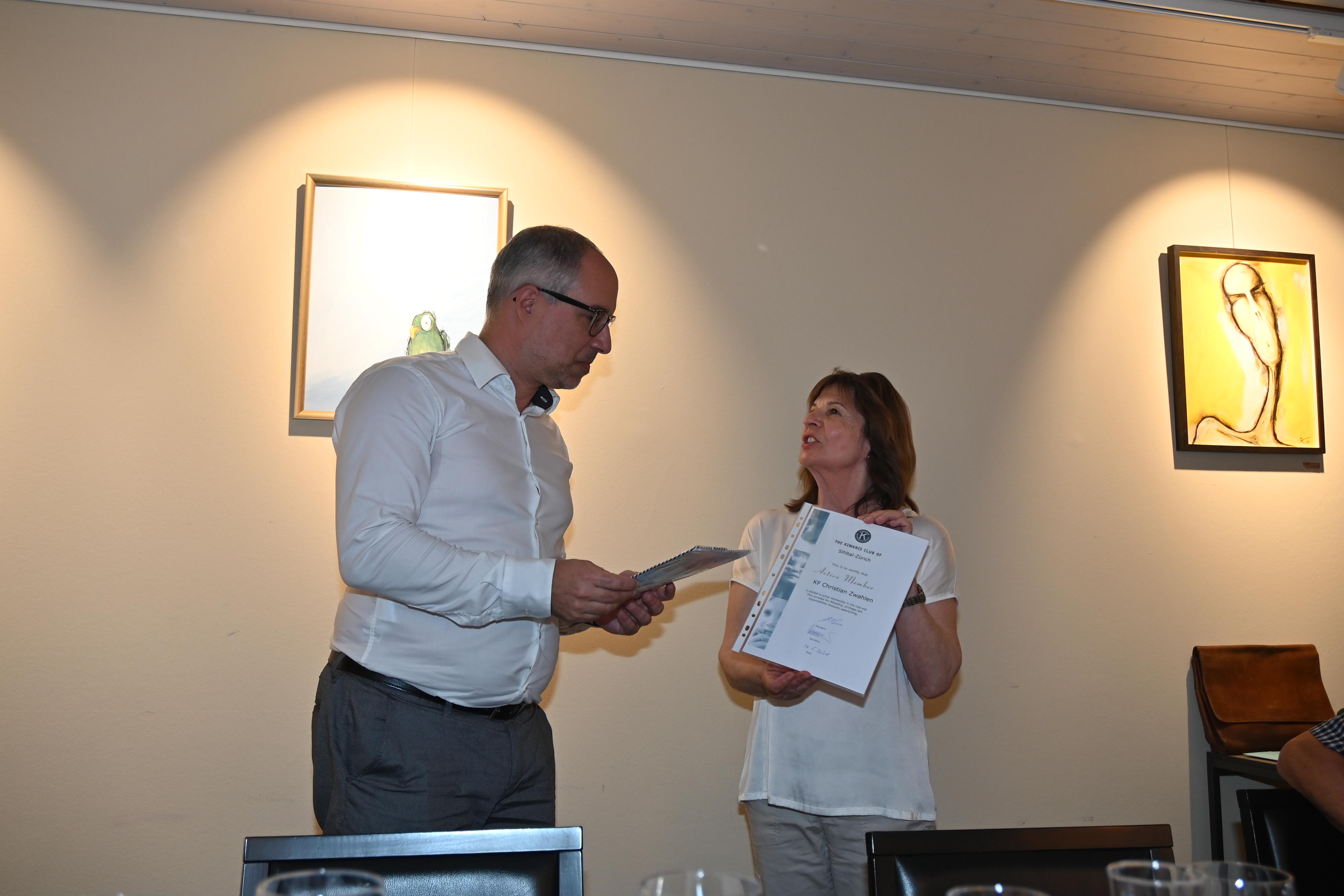 In Ihrer Eigenschaft als ‘Chair Club Development Committee’ benützt Silvia Helbling die Gelegenheit der Pause vor dem Hauptgang um den Kandidaten, Christian Zwahlen, offiziell in den Kiwanis Club Sihltal-Zürich aufzunehmen. Nach kurzen Einführungsworten, Christian Zwahlen war schon einige Male bei Lunchs und Dinners dabei, überreicht ihm Silvia die Insignien: Ein Diplom, einen Club-Wimpel und einen Kiwanis-Pin. Der darauffolgende Willkommens-Applaus bestätigt seine definitive Aufnahme.