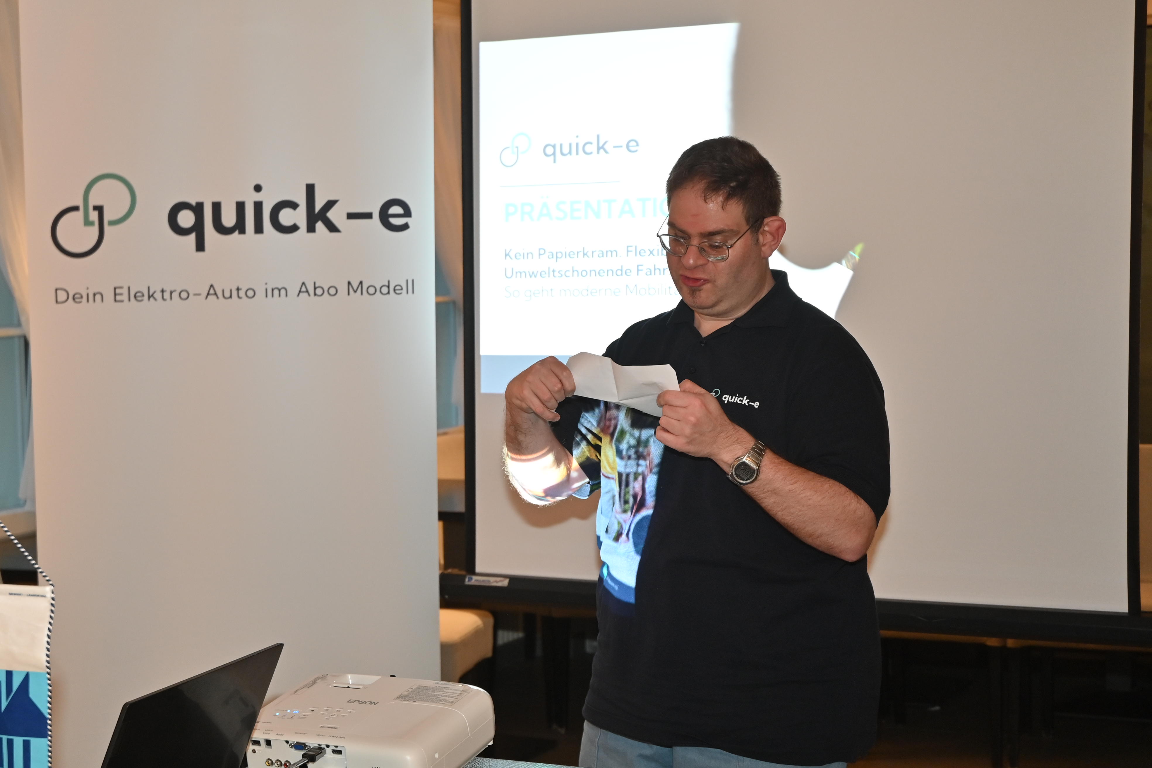 Luca Bencivinni, er ist leicht eingeschränkt doch vif, arbeitet als Praktikant bei Quick-e und stellt sich selber kurz vor. Im Büro erledigt er leichtere Arbeiten wie Telefondienst, Botengänge, Ablage und ähnliches. Er fühlt sich rundum sehr wohl, da seine Arbeit abwechslungsreich ist und geschätzt wird.