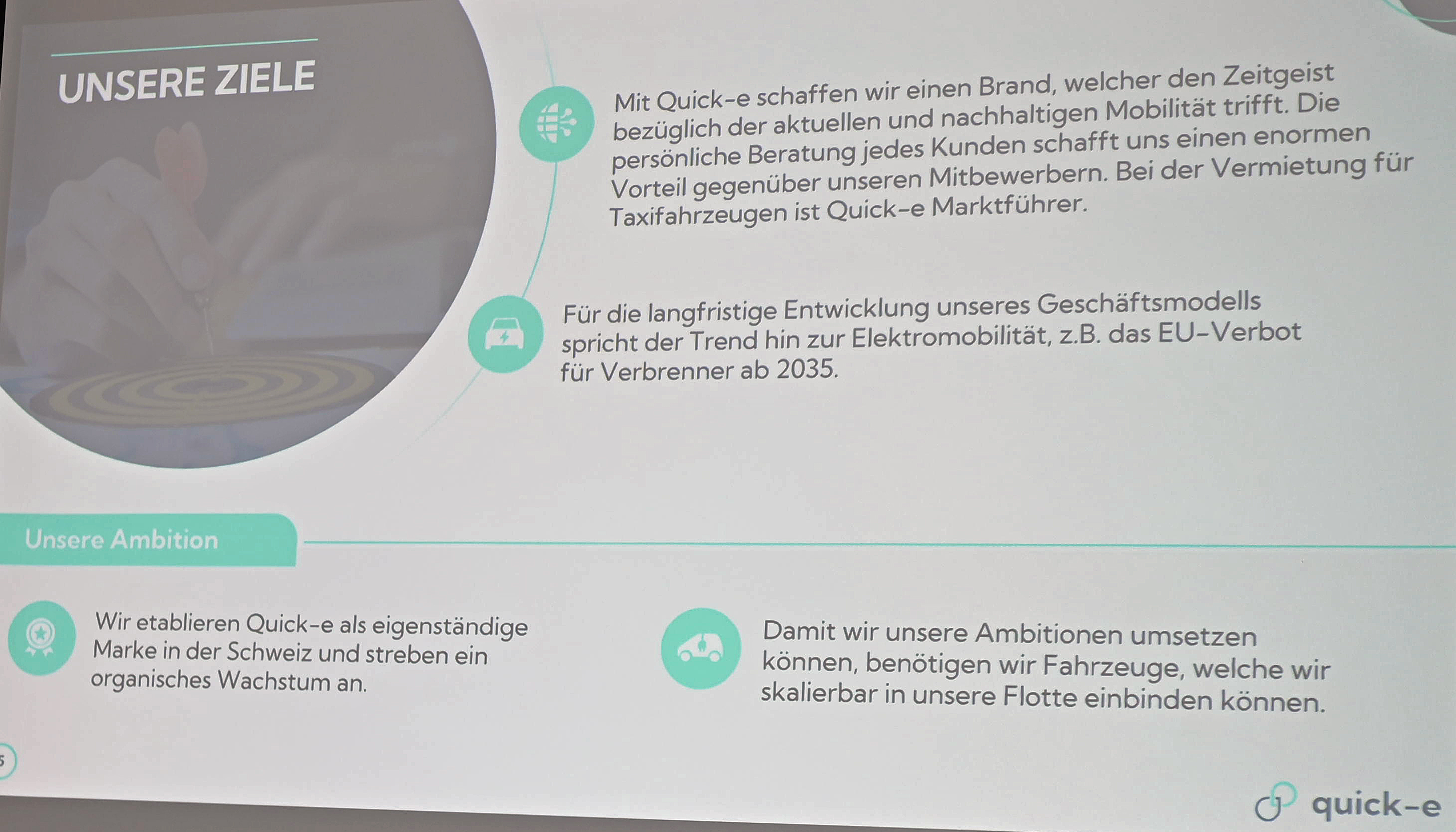 Dank seinen jahrelang erworbenen Kenntnissen, Erfahrungen und Verbindungen mit dem eigenem Limousinenservice und der Zusammenarbeit mit dem Taxi- und Limousinengeschäft ist Quick-e über Erwarten gut gestartet. Nach bereits einem Jahr hat man den «Break-even-Punkt», also die Gewinnschwelle erreicht. Und dies ohne kostspielige Werbung. Nächste Meilensteine sind der Ausbau der Fahrzeugflotte, der Aufbau von Partnerschaften, die Ausweitung des Bekanntheitsgrades, die Eröffnung weiterer Standorte in der Schweiz um nur die wichtigsten zu nennen.