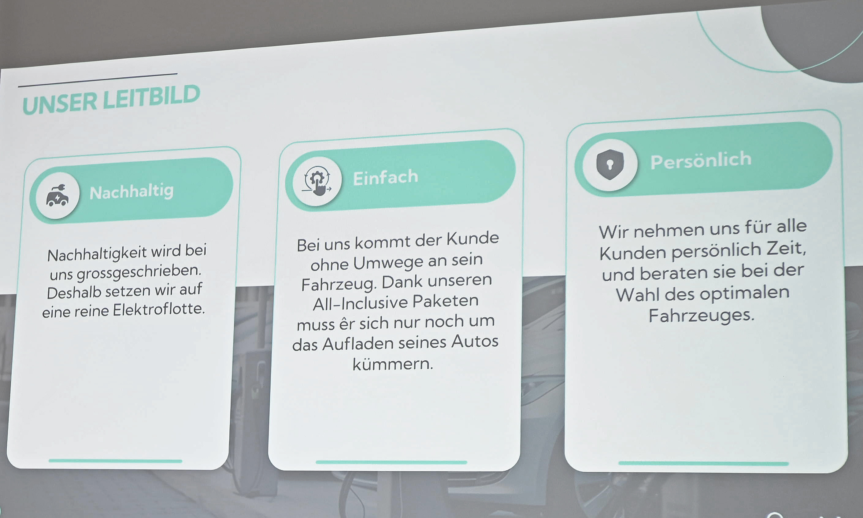 Mieten ab einem Tag bis zu unbegrenztem Zeitraum sind Programm. Auf Wunsch kann das Auto nach Abschluss der Miete gekauft werden. Beratung gibt es nicht nur für die Autos, sondern auch zu mobilen und festen Wallboxen. Man versteht sich als Fahrzeugvermieter, aber auch als Dienstleister der Elektromobilität.
