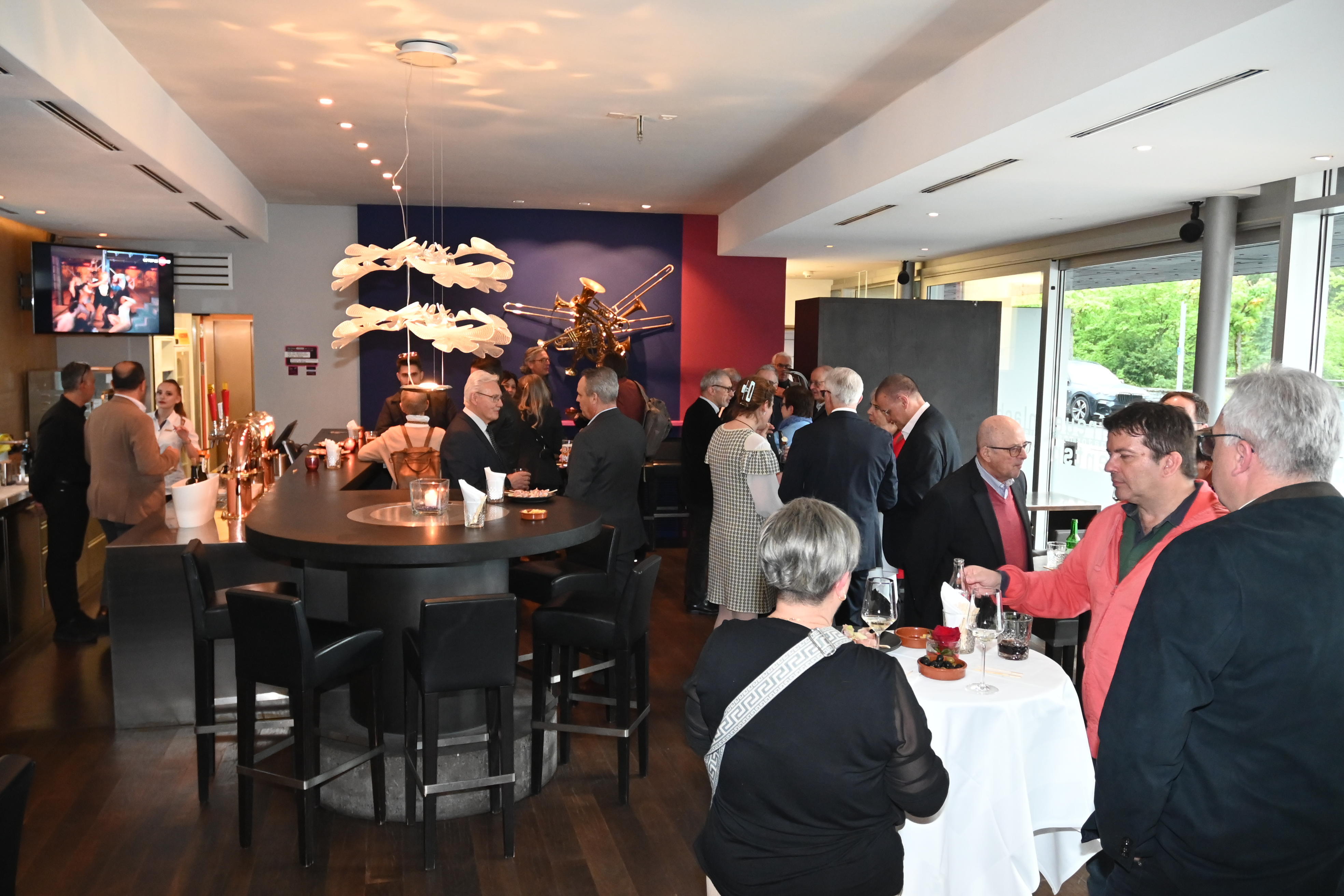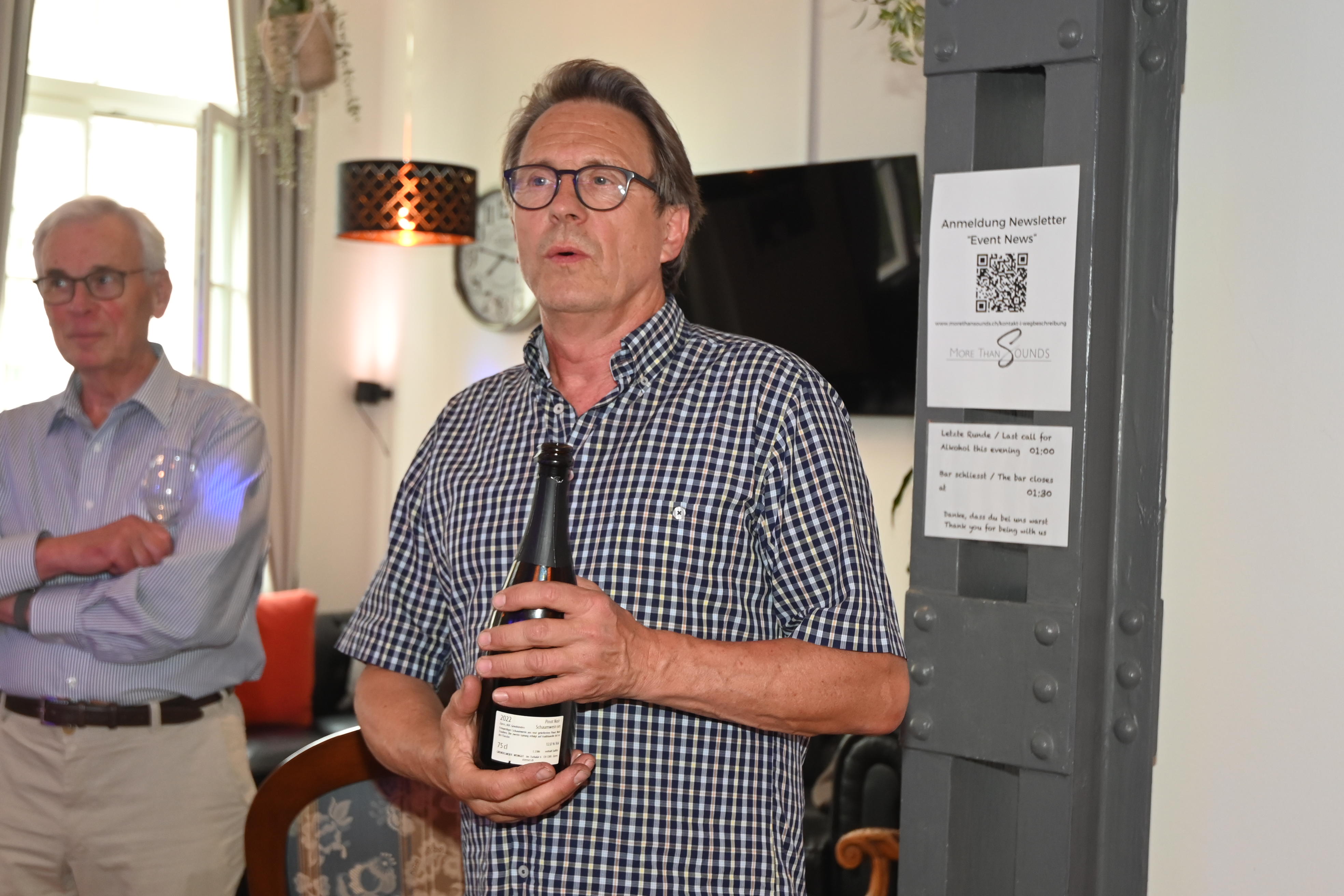 Schon vor 18.15 Uhr treffen die ersten Mitglieder in der Rössli Bar ein um sich vom «Perla Rosa», dem rosa Schaumwein (brut) verzaubern zu lassen. Dank dem baldigen Saftabzug der roten Pinot Noir Trauben bleibt ein rosaroter Saft für die kühle Gärung sowie der anschliessend zweiten Gärung in der Flasche (traditionelle Methode). Es entsteht ein erfrischender feinperliger Schaumwein, der den Gaumen mit der Note Erdbeere und Johannisbeere beglückt. Dazu hat die Küche verschiedenste feinknusprige Canapés kreiert.