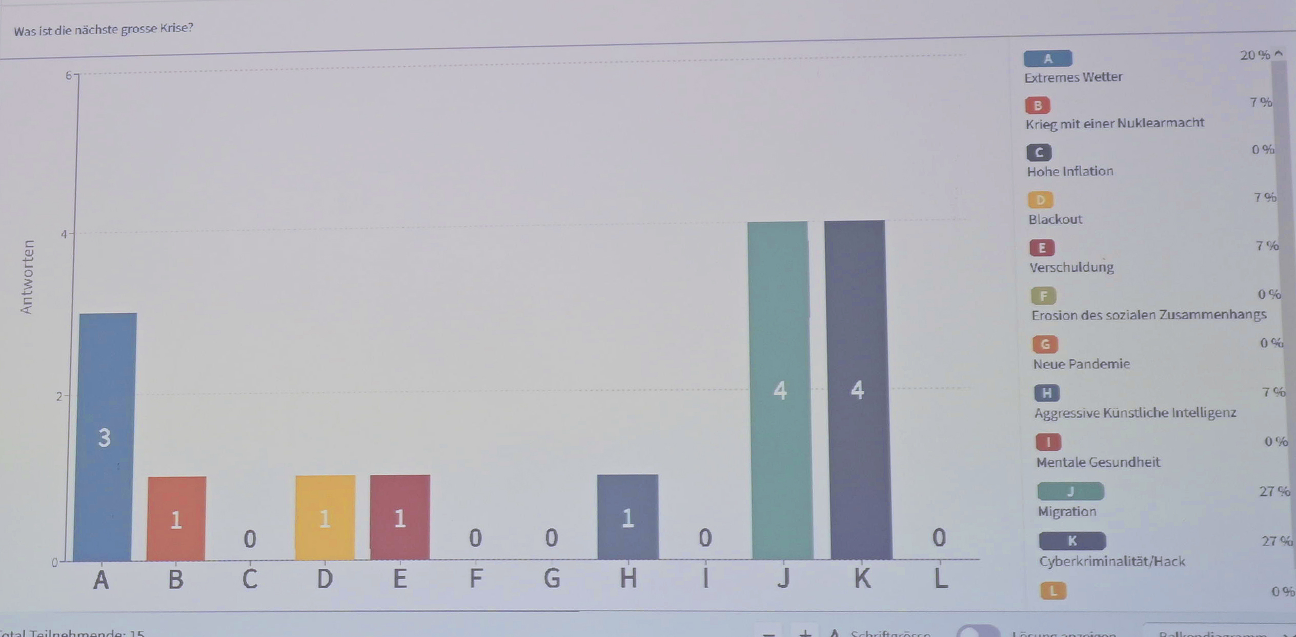 Von den 17 Teilnehmern sagten je 4, dass Migration oder Cyberkriminalität die grösste zukünftige Krise bringen würden. 3 sagten, dass es extremes Wetter sei, und die anderen Stimmen verteilten sich auf andere Krisen. Das zentrale Ergebnis ist, dass es kaum Einigkeit unter den Anwesenden gab, dass es also sehr schwierig ist zu wissen, wo die nächste Krise lauert.
