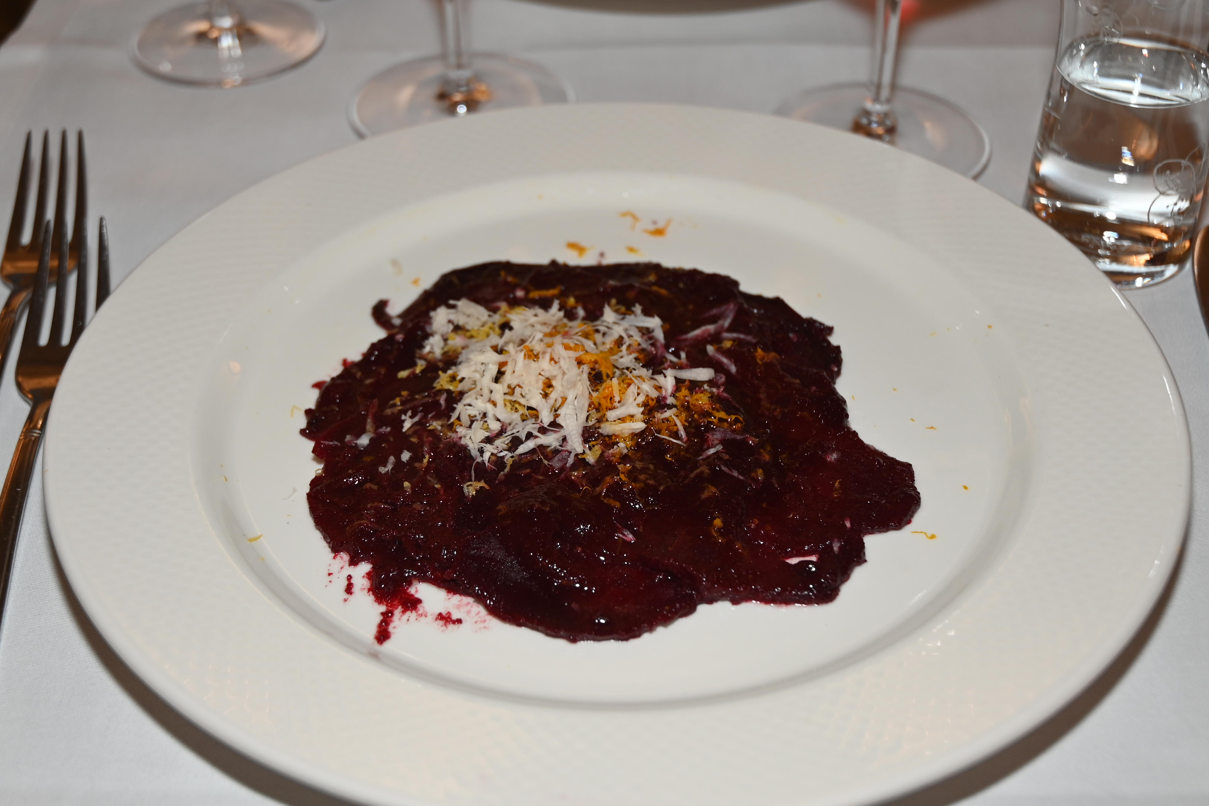 Es folgt die kalte Vorspeise, ein fein gewürztes Randencarpaccio, veredelt mit geraffeltem Meerrettich und Zitronenzest. Sie wird begleitet von «Il Rubin» (Der Rubinrote), einem starken Pinot Noir, der der pfiffig gewürzten Rande sowohl geschmacklich, als auch farblich standhält. Il Rubin wird, zusammen mit einem Drittel Neuholz, 12 Monate im französischen Barrique gereift. Il Rubin ist ein rubinroter, harmonischer Wein, dessen Abgang ein Bouquet von reifen Kirschen, Vanille und feinen Röstaromen hinterlässt.