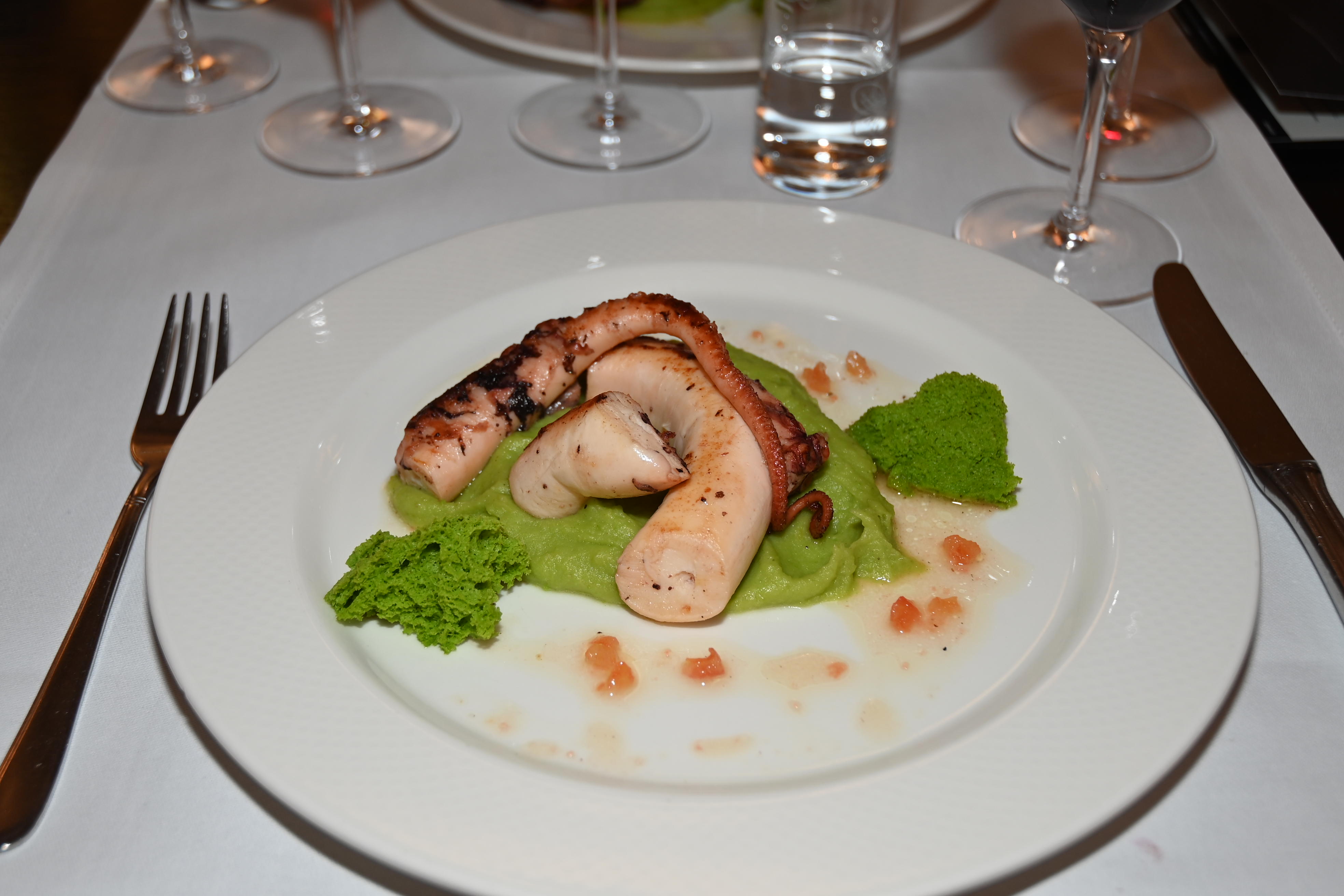 Als Krönung hat sich die Küche einen «Pulpo» (spanisch für Kraken) einfallen lassen und diesen punktgenau gebraten. Für die Präsentation auf den Tellern wurde das Fleisch auf einem grünen Erbsen-Kartoffelpüree angerichtet und von gebackenen Petersilienschaum-Rosetten flankiert. Für Vegetarier wird feiner Spargel mit ebensolcher Sauce Hollandaise serviert. Als starke Begleitung dazu, zeigt sich der «Trais Cotschens» (Drei Rote). Wie der Name sagt, wird er aus drei verschiedenen Rebsorten gekeltert: Merlot, Cabernet Dorsa und Zweigelt. Wie ’Il Rubin’ wird er 12 Monate im französischen Barrique mit einem Drittel Neuholz gereift. Er entwickelt sich dabei zu einer tiefroten, gehaltvollen Cuvée und verzückt Gaumen und Nase mit Brombeere, schwarzer Kirsche und Vanille.