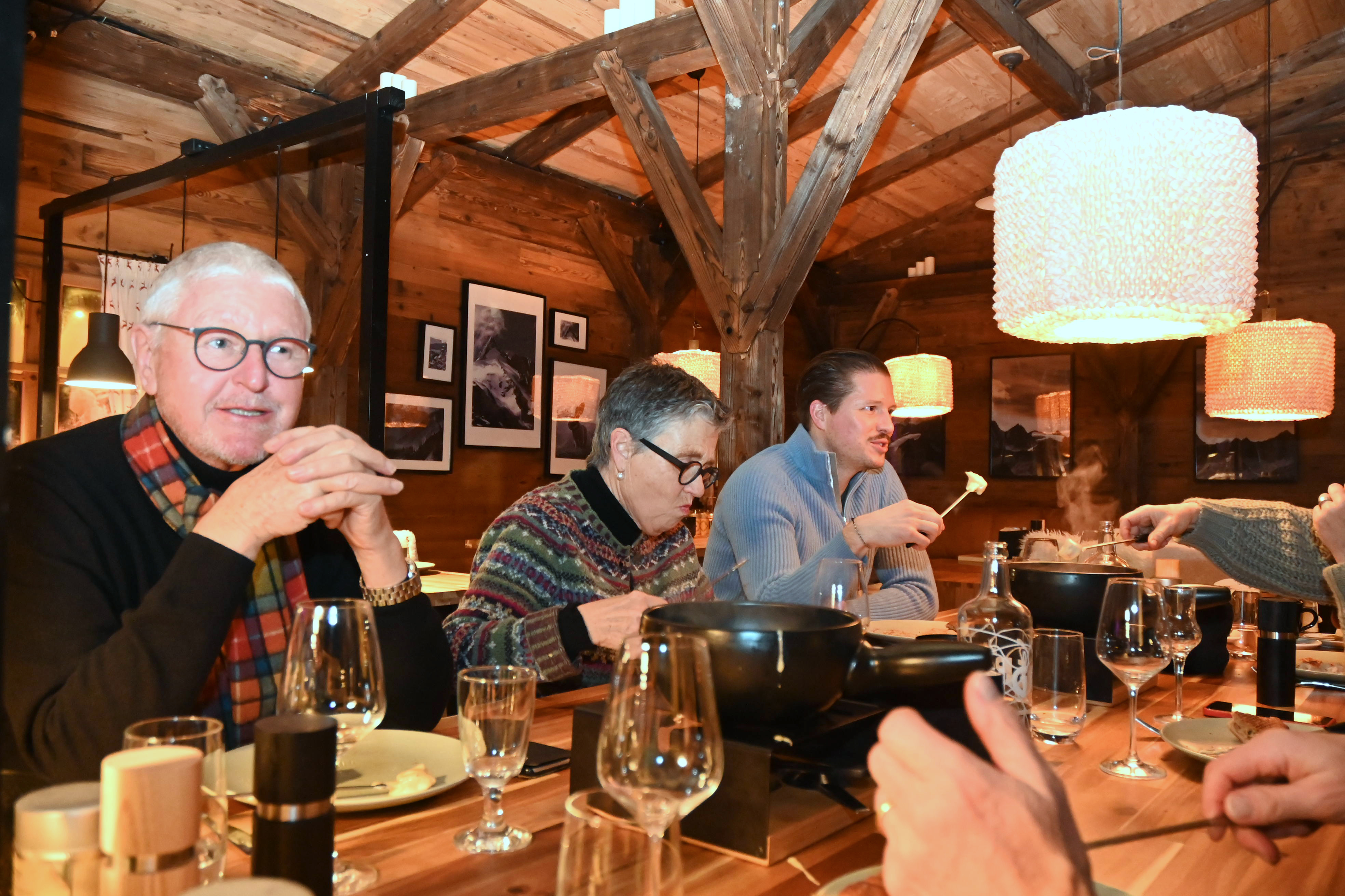 Im gemütlichen Holzhäuschen wurden anschliessend als Vorspeisen Salat oder Suppe, als Hauptspeisen Fondue oder Raclette serviert und intensive Gespräche geführt.