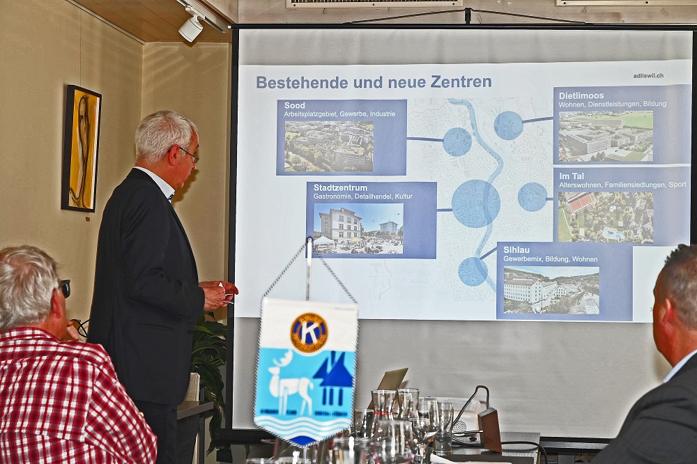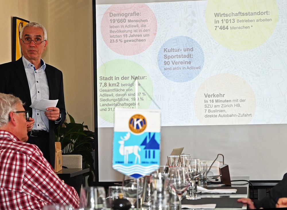 Insgesamt 13 Mitglieder und 3 Gäste folgten äusserst aufmerksam dem Referenten durch dessen umfassenden und kurzweiligen Überblick auf die Stadt Adliswil. Beginnend bei der Demografie erfuhren sie, dass derzeit 19'660 Menschen in Adliswil leben und die Bevölkerung in den letzten 15 Jahren um 23,5% gewachsen ist. Der Wirtschaftsstandort beschäftigt in 1’013 Betrieben 7'464 Menschen und insgesamt 90 Vereine sind in unserer Stadt aktiv! Die perfekte Verkehrs - Anbindung zeigt sich während der Hauptverkehrszeiten im 10 Minuten Takt der SZU nach Zürich HB (Reisezeit 16 Minuten), durch 7 Buslinien in die ganze Region und die direkte Autobahn-Zufahrt.