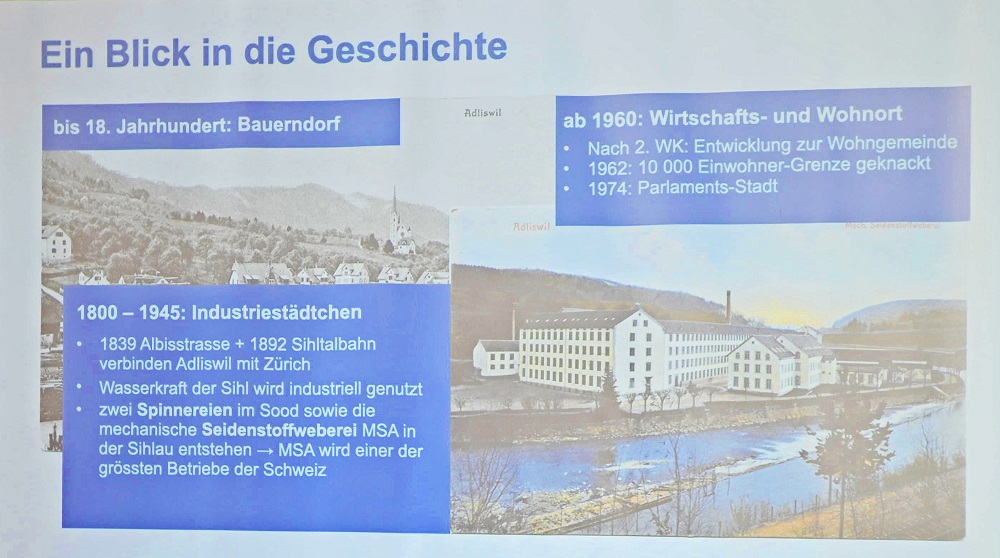 Ein Blick in die Geschichte zeigt Adliswil bis ins 18. Jahrhundert als Bauerndorf. In der Zeit von 1800 bis 1945 entwickelte es sich zum Industriestädtchen. Voraussetzung dazu waren 1839 der Ausbau der Albisstrasse und 1892 der Sihltalbahn nach Zürich. Ebenso wurde die Wasserkraft der Sihl industriell genutzt. Zwei Spinnereien im Sood sowie die mechanische Seidenstoffweberei MSA in der Sihlau entstanden, wobei die MSA zu einem der grössten Betriebe der Schweiz aufsteigt. Nach dem zweiten Weltkrieg, ab ca. 1960, entwickelt sich der Ort zur Wohngemeinde und knackt 1962 die 10'000 Einwohner-Grenze. 1974 wird Adliswil zur Parlaments-Stadt, feiert heuer, 2024, also das 50-Jahr-Jubiläum dieser Form der demokratischen Mitbestimmung.