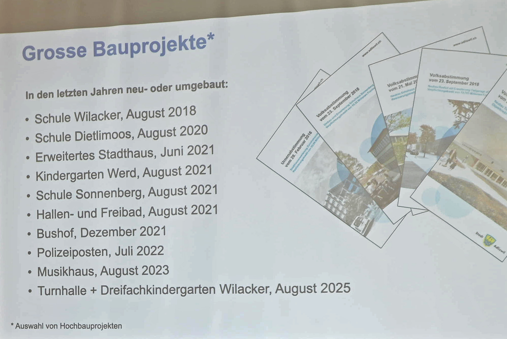 Was wäre eine umfassende Präsentation zu Adliswil ohne «Grosse Bauprojekte» und Investitionen und Steuern. Denn um die Attraktivität der Stadt Adliswil zu erhalten, mussten in den vergangenen Jahren zahlreiche Gebäude aus den 60 Jahren saniert und erweitert werden. Dazu kamen neue Investitionen in einen Bushof im Zentrum sowie Schulhäuser in verschiedenen Quartieren. Über die vergangenen 10 Jahre hat die Stadt Adliswil rund 200 Millionen Franken investiert. Dies bei einem stabilen Steuerfuss und einer moderaten Zunahme der Verschuldung.
