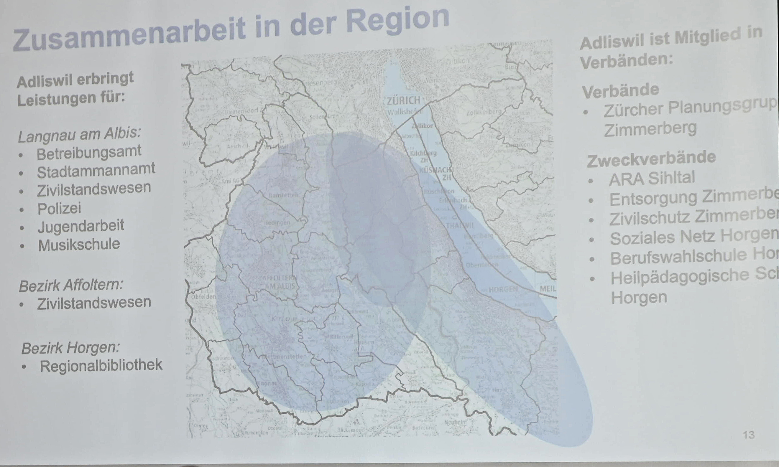 Desgleichen gehört dazu ein Ausblick für die nächsten Jahre. Zahlreiche Herausforderungen stellen sich Adliswil, der Region Zimmerberg und dem gesamten Kanton Zürich. Dabei sind die wichtigsten Treiber für Veränderungen die demografische Entwicklung, die damit einhergehende Verdichtung und Anforderungen an die Mobilität. Adliswil ist gut gerüstet und ein aktiver Partner für die Zusammenarbeit in der Region – entsprechende Bilder der Folien zum Referat geben dazu kurze Hinweise.